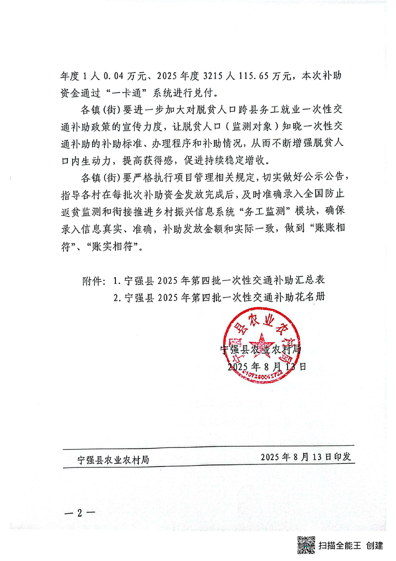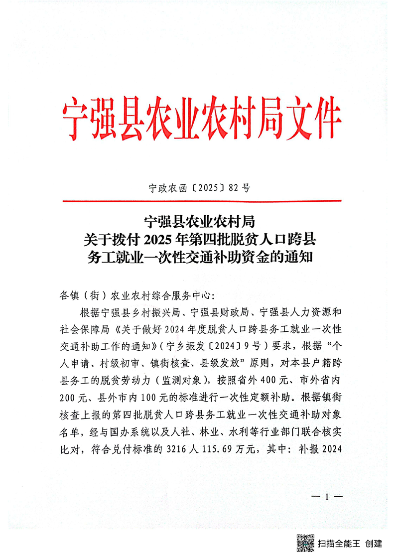 寧強(qiáng)縣農(nóng)業(yè)農(nóng)村局關(guān)于撥付2025年第四批脫貧人口跨縣務(wù)工就業(yè)一次性交通補(bǔ)助資金的通知