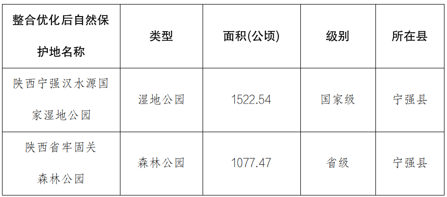 三、此次我縣自然保護地進一步整合優(yōu)化僅涉及2處自然公園,分別是陜西寧強漢水源國家濕地公園和陜西省牢固關(guān)森林公園,進一步整合優(yōu)化后,總面積2600.01公頃。