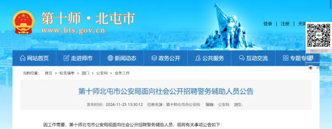 因工作需要,第十師北屯市公安局現(xiàn)面向社會(huì)公開招聘警務(wù)輔助人員,現(xiàn)將有關(guān)事項(xiàng)公告如下: