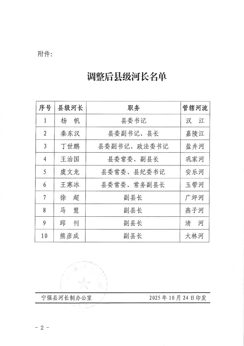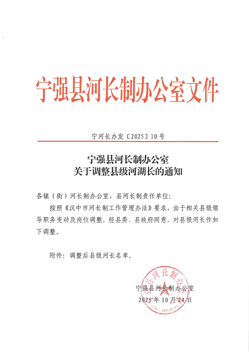寧強(qiáng)縣河長(zhǎng)制辦公室關(guān)于調(diào)整縣級(jí)河湖長(zhǎng)的通知